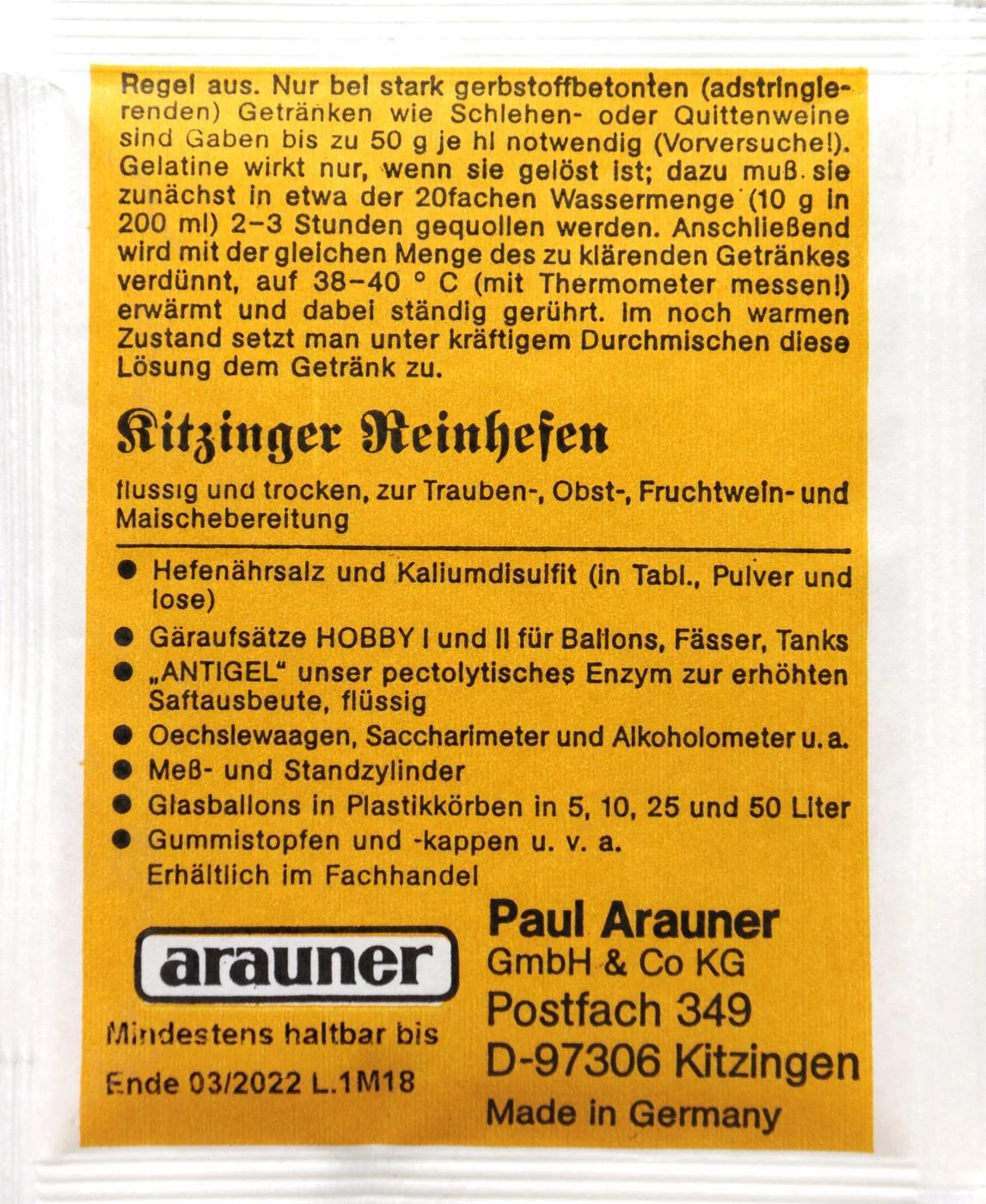 Deinen selbsthergestellten Wein kannst du ganz einfach mit der gekörnten Gelatine von Kitzinger aufhübschen. Trübungen werden beseitigt und auch der Geschmack kann sich dadurch verbessern.