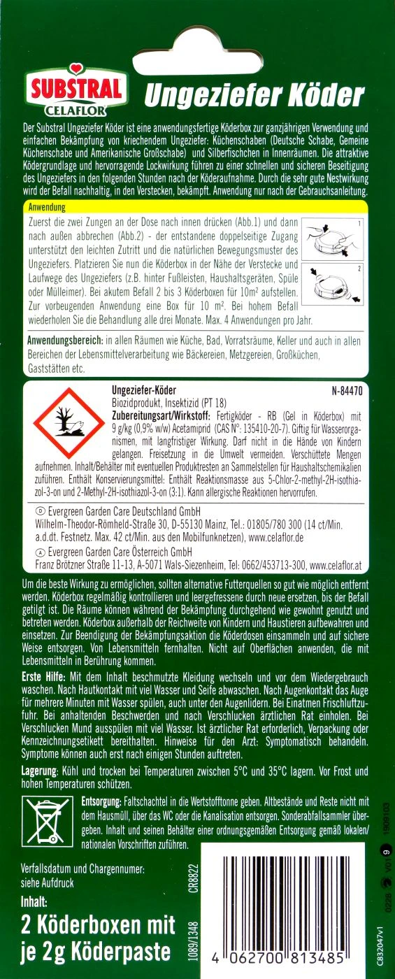 Einfach, einfacher, Köderbox! Der Ungeziefer Köder von Substral Celaflor ist ein kleines Döschen, mit hervorragender Lockwirkung gegen krabbelndes Ungeziefer im Haus. Du musst nichts weiter tun, als die Box in der Nähe der Verstecke aufzustellen und abzuwarten. Sobald der Köder leergefressen wurde, kannst du eine neue aufstellen.